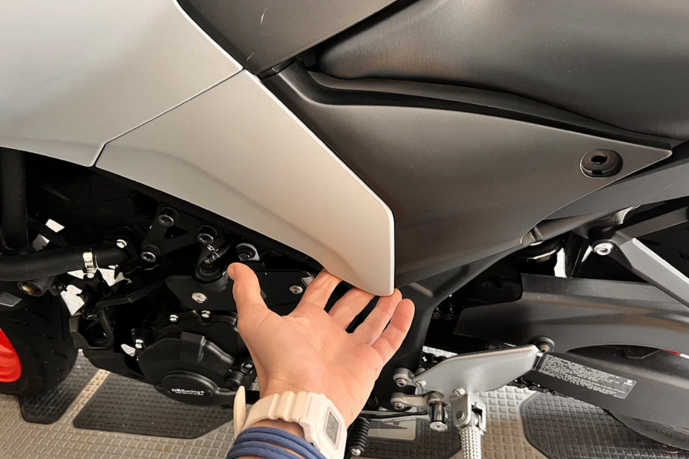 - Connect the new side and part cover, side 6 (see step 4), to the bike.
