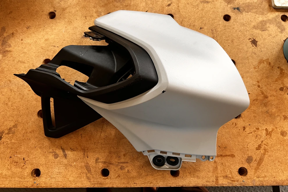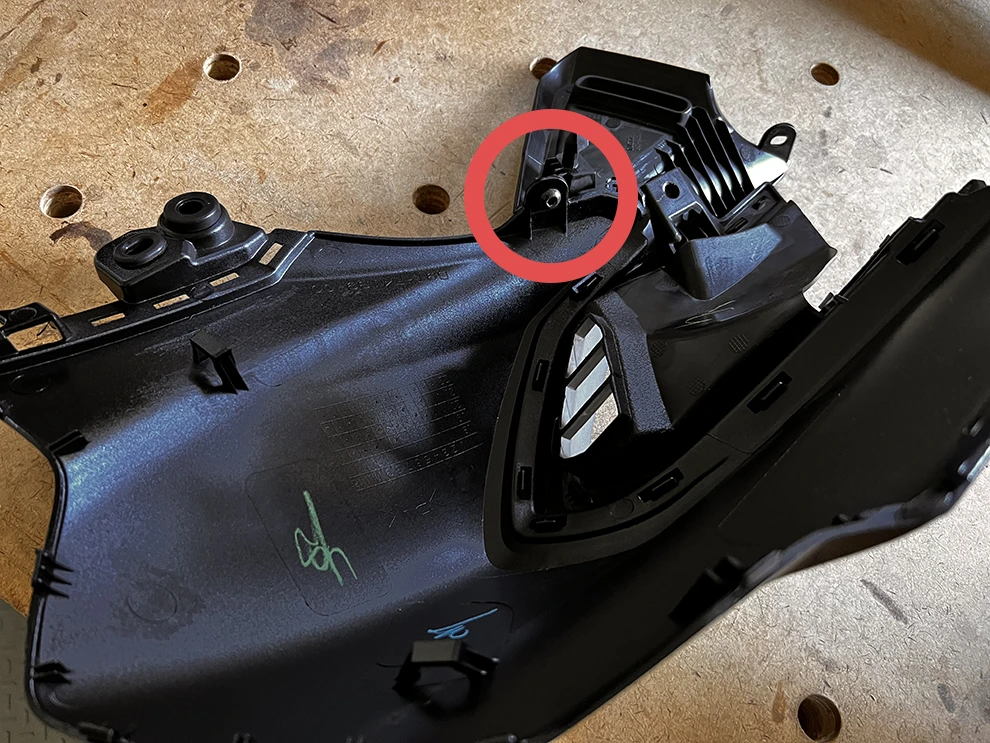 - Place and tighten the hidden screw (see step 13) going through the inner framework and the main cover. Note that this screw does not connect to the bike.