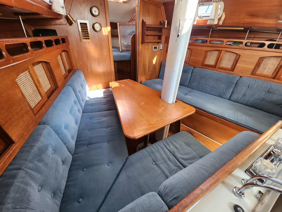 The interior layout of the Ericson 34 is designed for easy living and easy operation at sea or on the mooring, emphasizing the privacy afforded by separate cabins located fore and aft of a comfortable living area comprised of the galley and main salon, where crew and friends can converse, relax and dine.