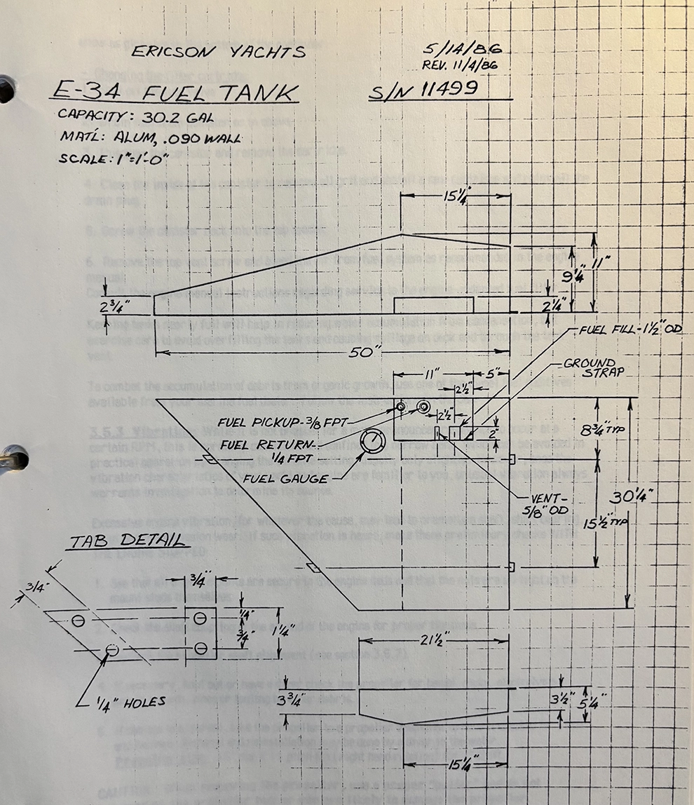 A 30 gallon aluminum fuel tank is located under the quarter berth. It is secured in place with four welded tabs which are screwed into recesses in the bunk top. The fuel pick-up, fuel return, and fuel guage are located in a recess on the forward end of the tank. The fuel fill hose fitting, vent fitting and grounding lug are located on the aft side of the recess. (see Fuel Tank diagram following page).