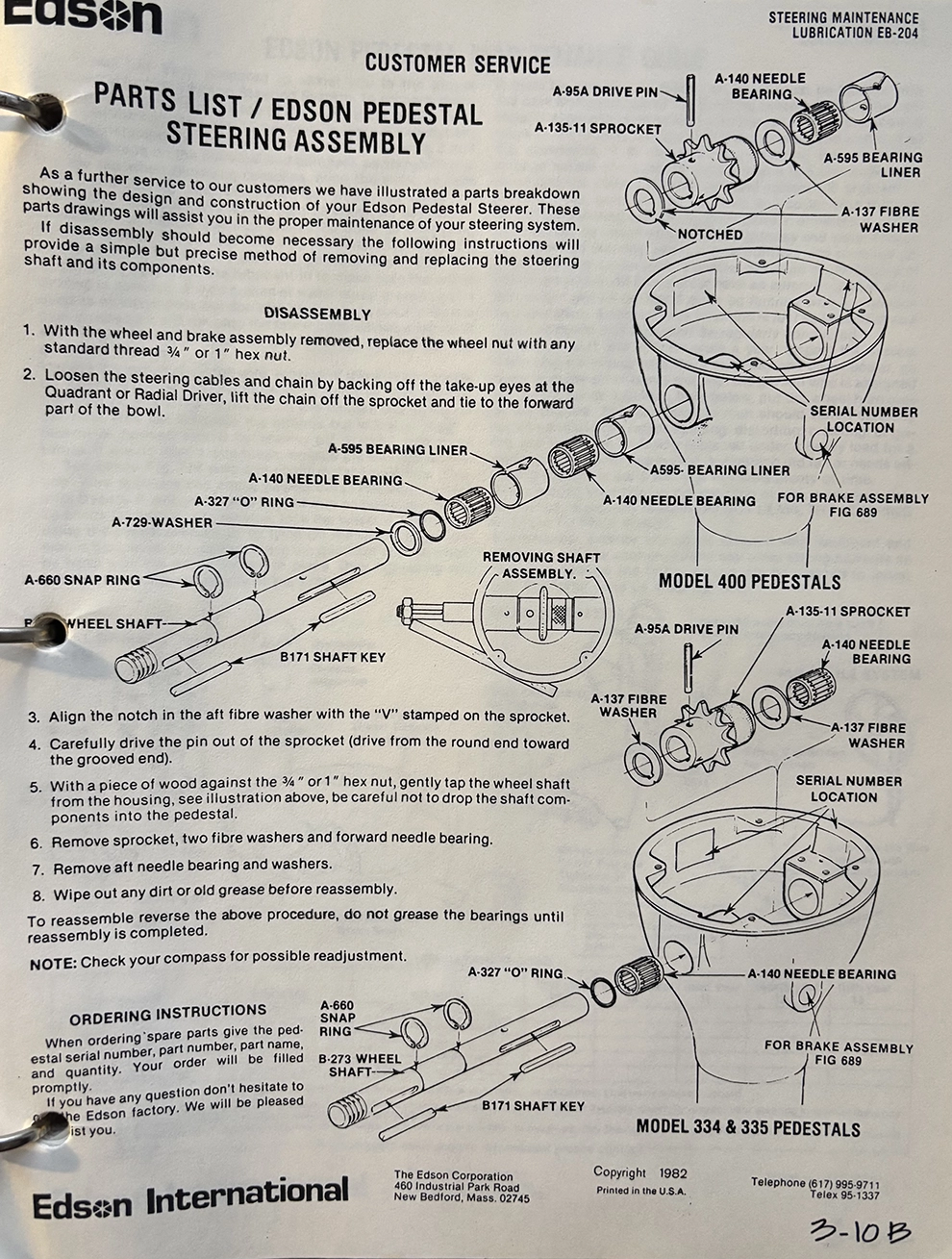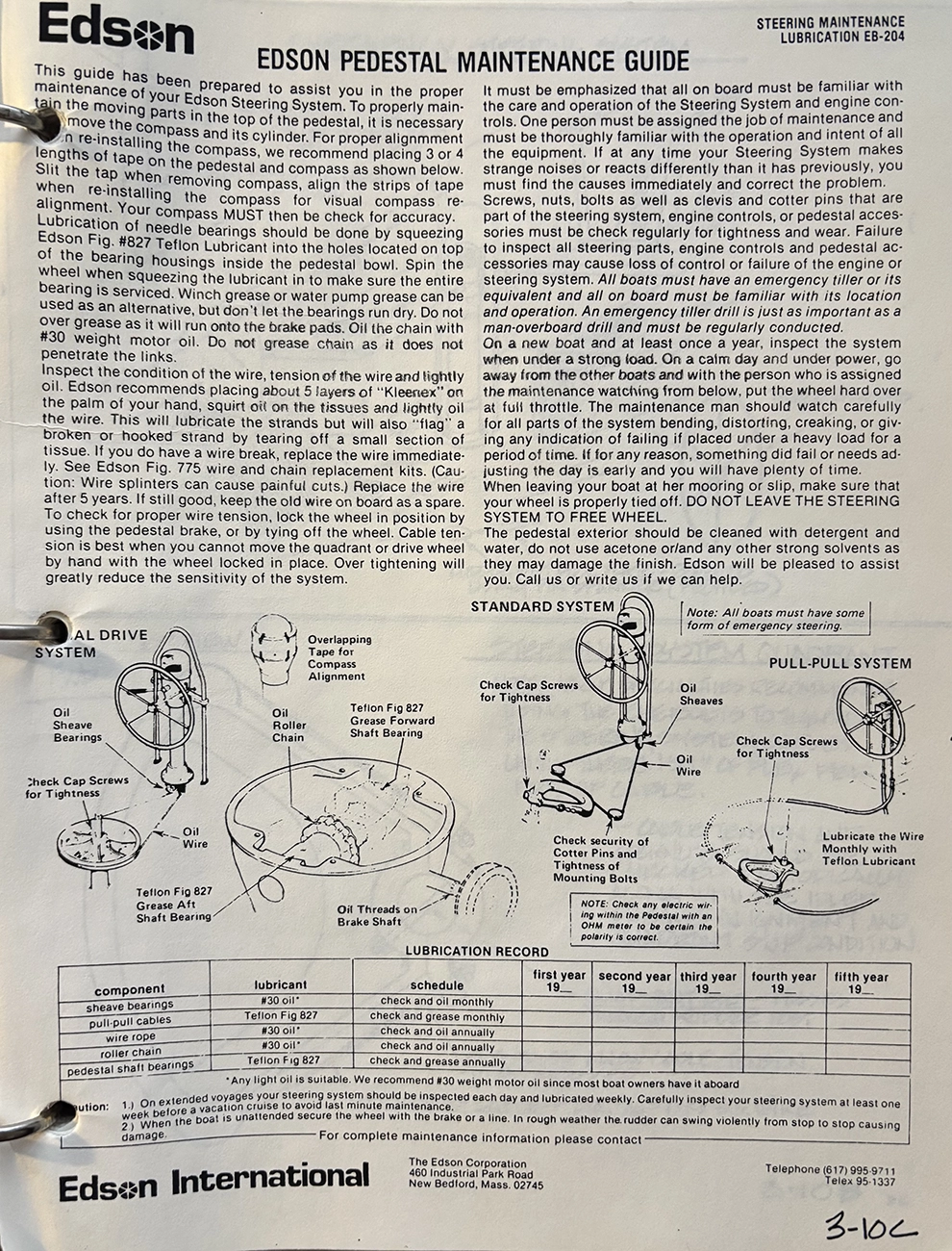 - Inspect the chain and its terminals by turning the wheel and viewing it from both the top of the pedestal and below the cockpit sole. Lubricate the chain twice a year with light oil or a spray teflon lubricant such as "Tri-flon".