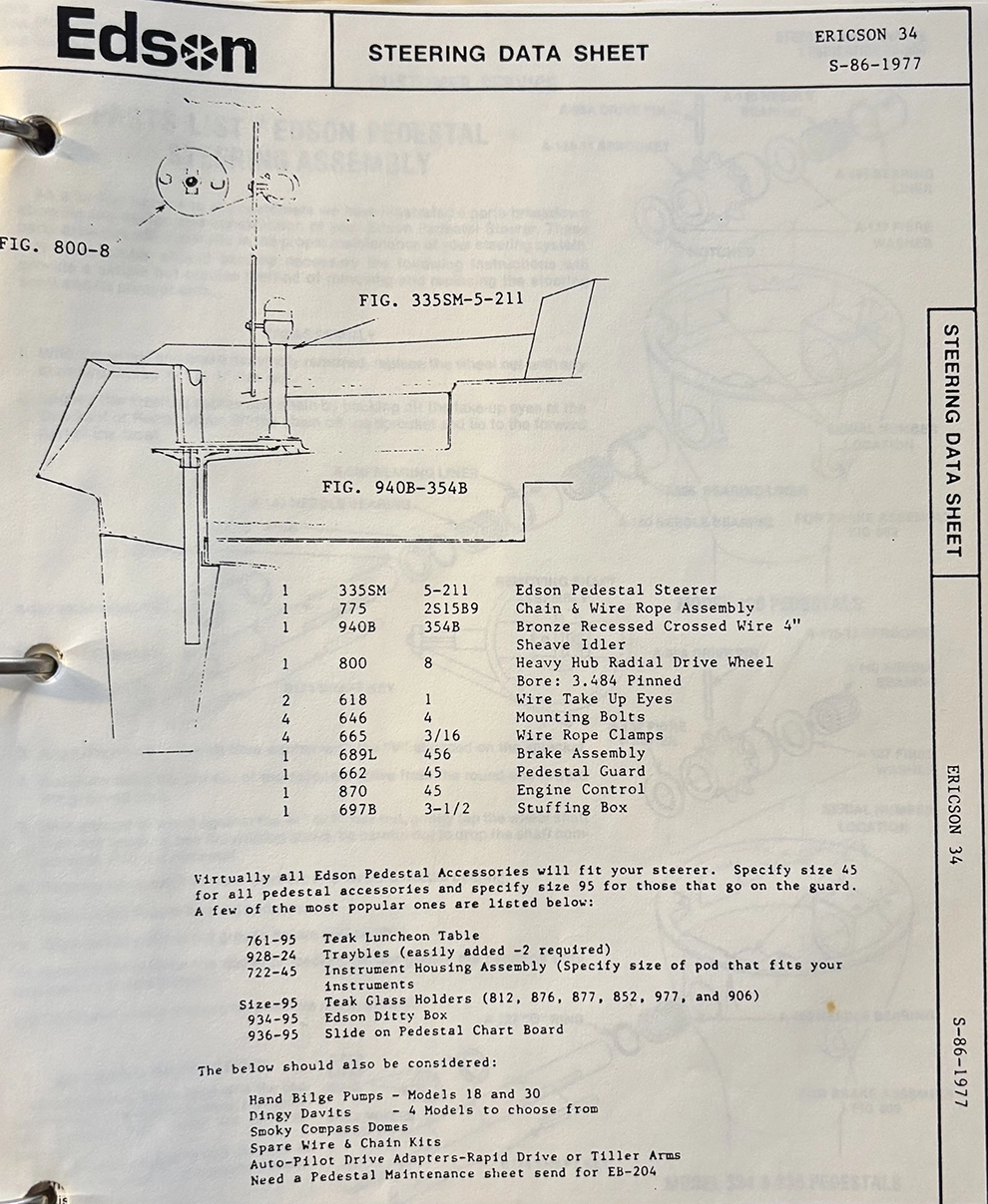 Your Ericson 34 comes equipped with pedestal steering with a 36" destroyer wheel, brake, pedestal guard, and engine controls mounted on the steering pedestal. Inside the pedestal a roller chain turns over a sprocket on the wheel shaft. The chain joins a cable at each of its ends which then runs through the cockpit sole via 2 sets of sheaves and to the rudder quadrant, which clamps and bolts onto the rudder shaft.