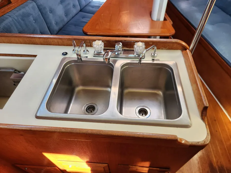 Lack of accessibility is partly the cause of neglect in many sailboats. Thru-hulls, valves and hoses are often hidden deep behind interior compartments and cabinet work. On the Ericson 34, this situation has been carefully considered and access to those fittings requiring regular and careful attention has been simplified by locating them in convenient areas. Opening a cabinet door or seat hatch provides easy exposure for anyone.